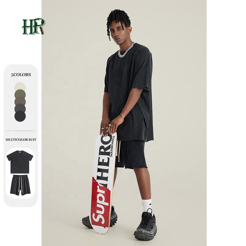 High Quality Summer 100% Cotton Streetwear Custom Washed Oversized T Shirt and Shorts Mens Short Set