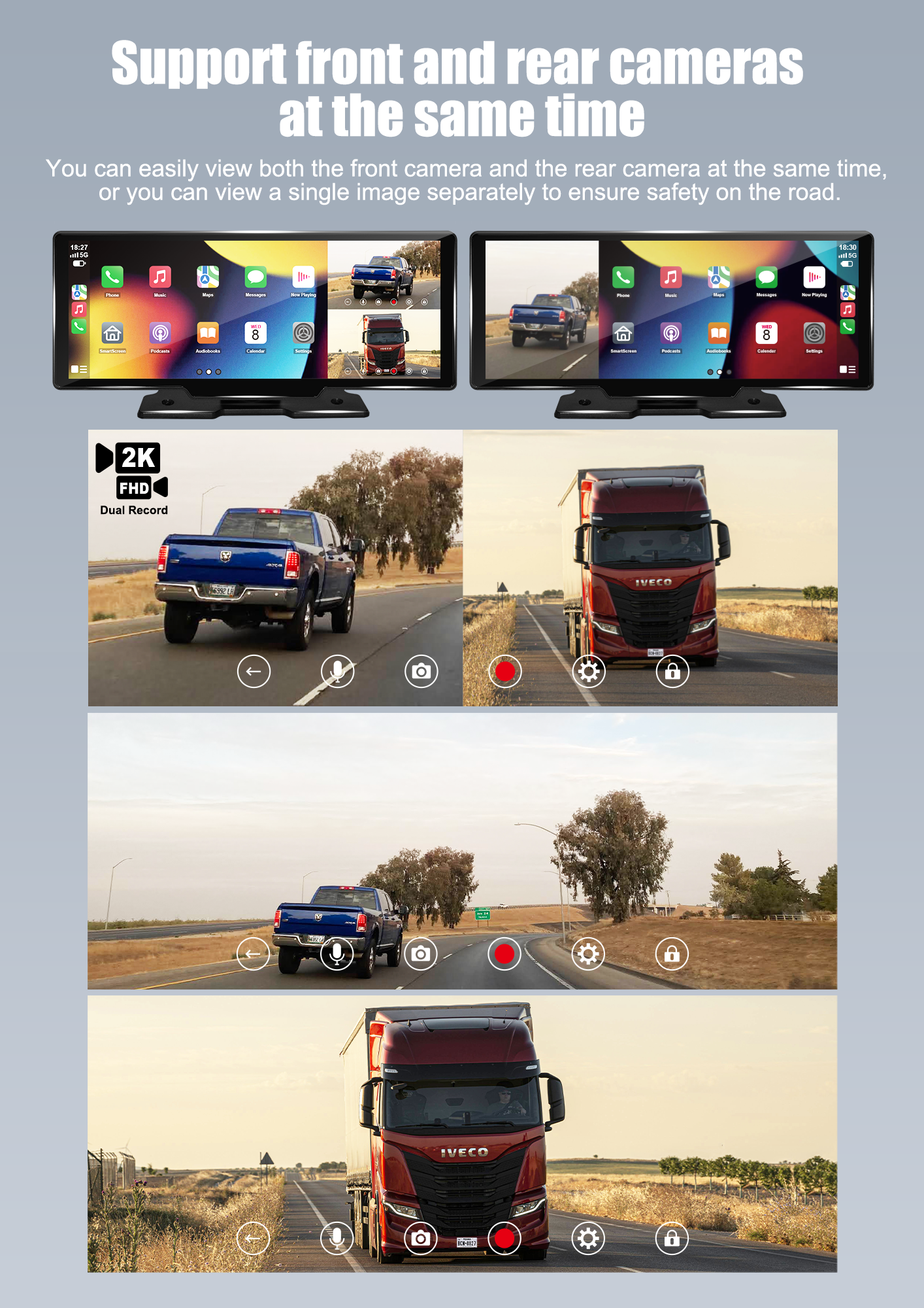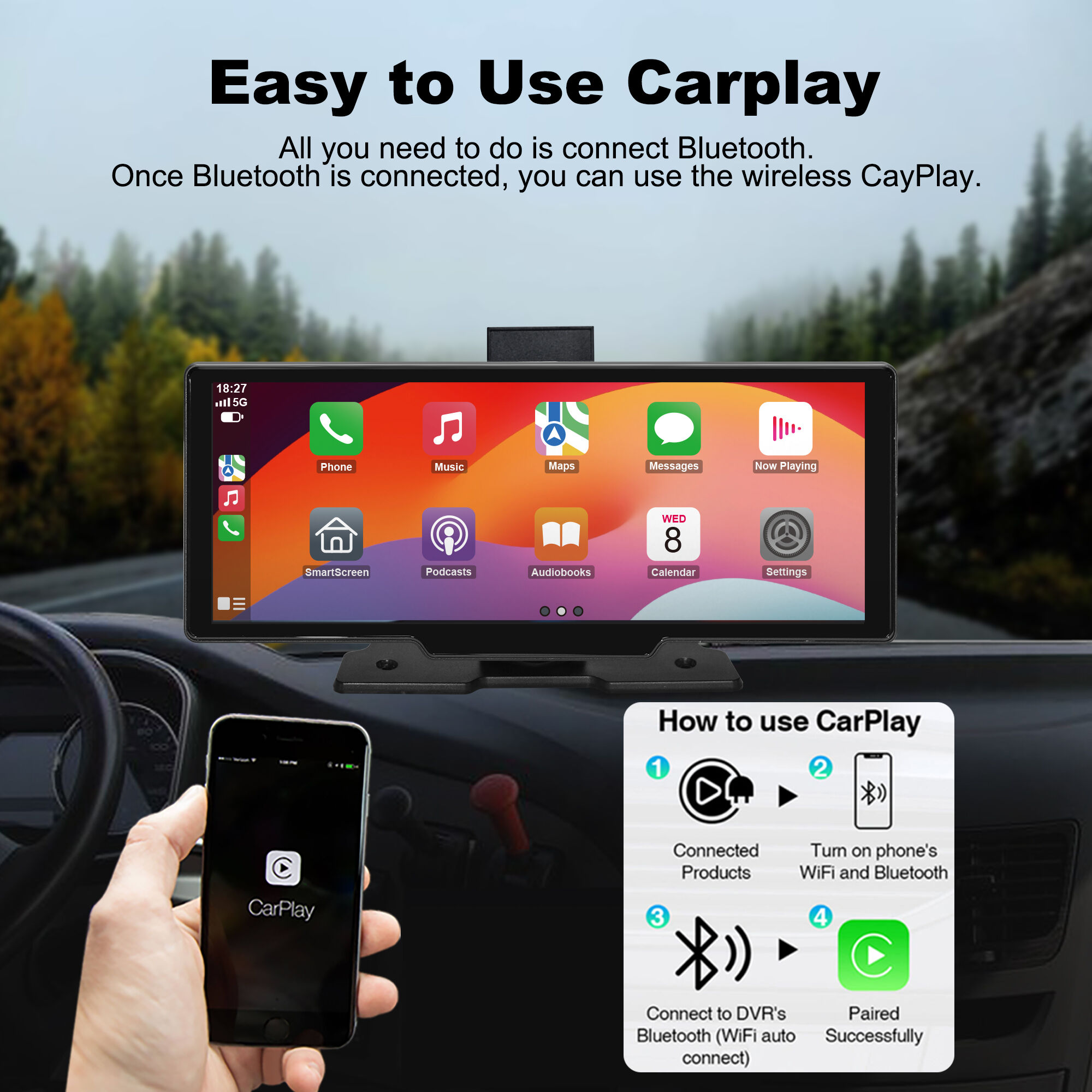 Add Wireless CarPlay & Wireless Android Auto Touchscreen To Your CarSimple connection to get a brand new touch screen experience, even if the original car does not come with a screen.The carplay display is compatible with wireless Apple Carplay and wireless Android Auto. You can use features like Siri/Maps/Music/Phone anytime, anywhere. With front and rear on-board cameras to automatically record and save video in case of emergency.Let you use a smarter and safer way to drive.