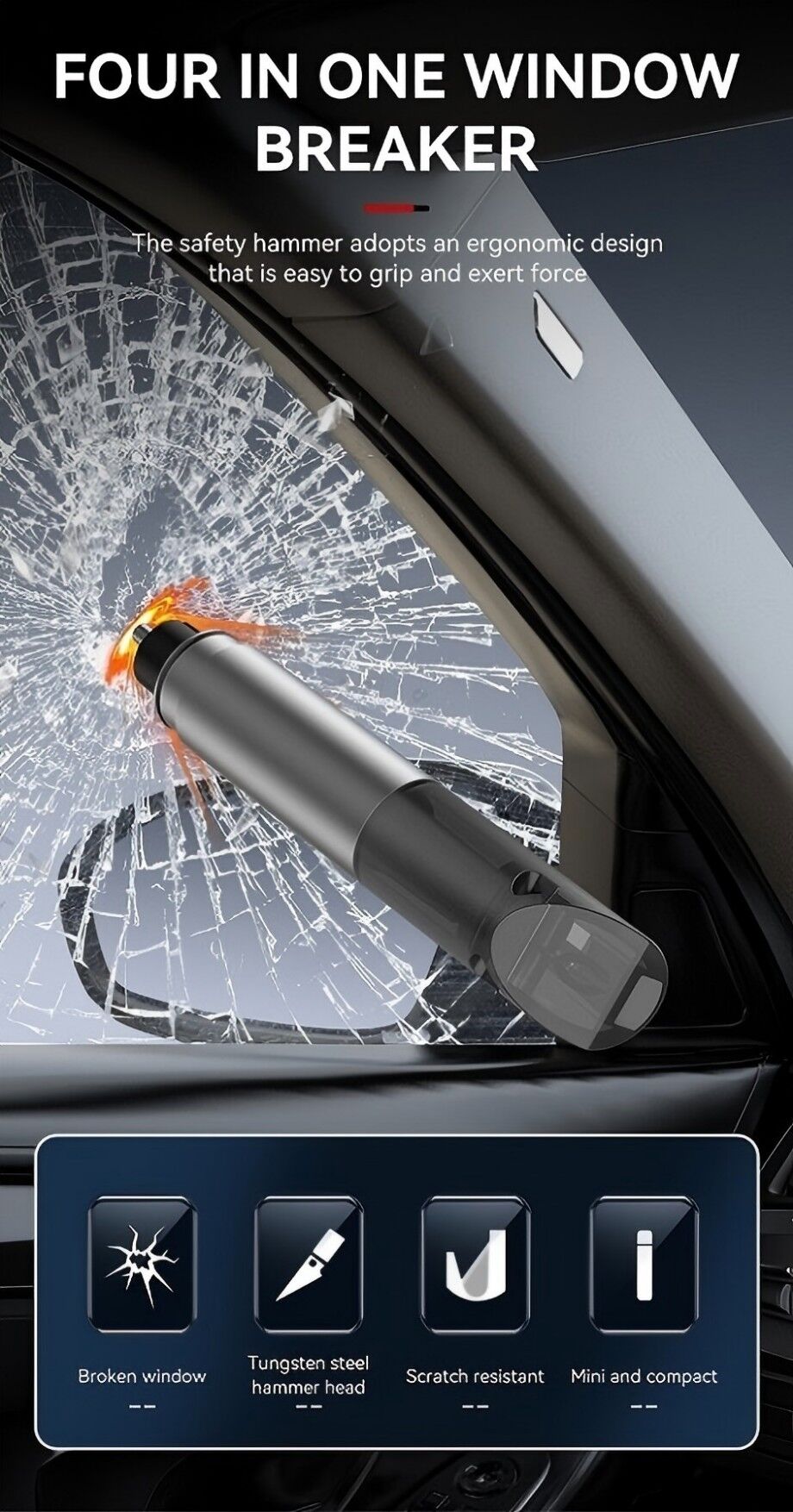 - Window Glass Breaker: The hammer features a sharp, heavy carbon steel point that can shatter in an emergency, allowing for quick escape from a vehicle that has been submerged in water or is otherwise in a precarious situation.