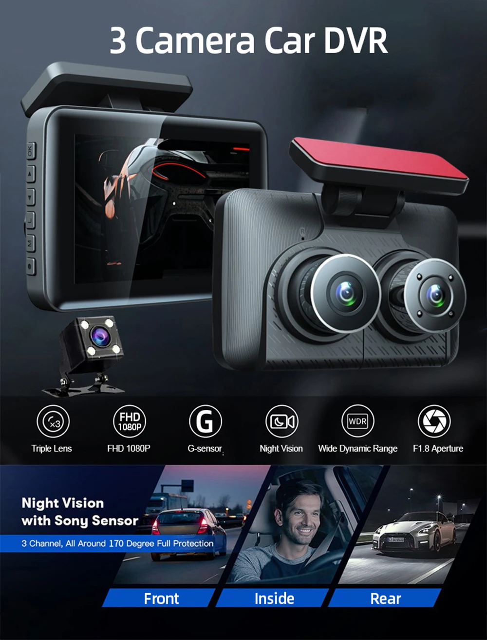 Be the first to review “3 Channel Dash Camera 3 Lens Car Dvr Video Recorder Dashcam DVRs Black Box Dual Lens DVR with Rear View Camera” Cancel reply