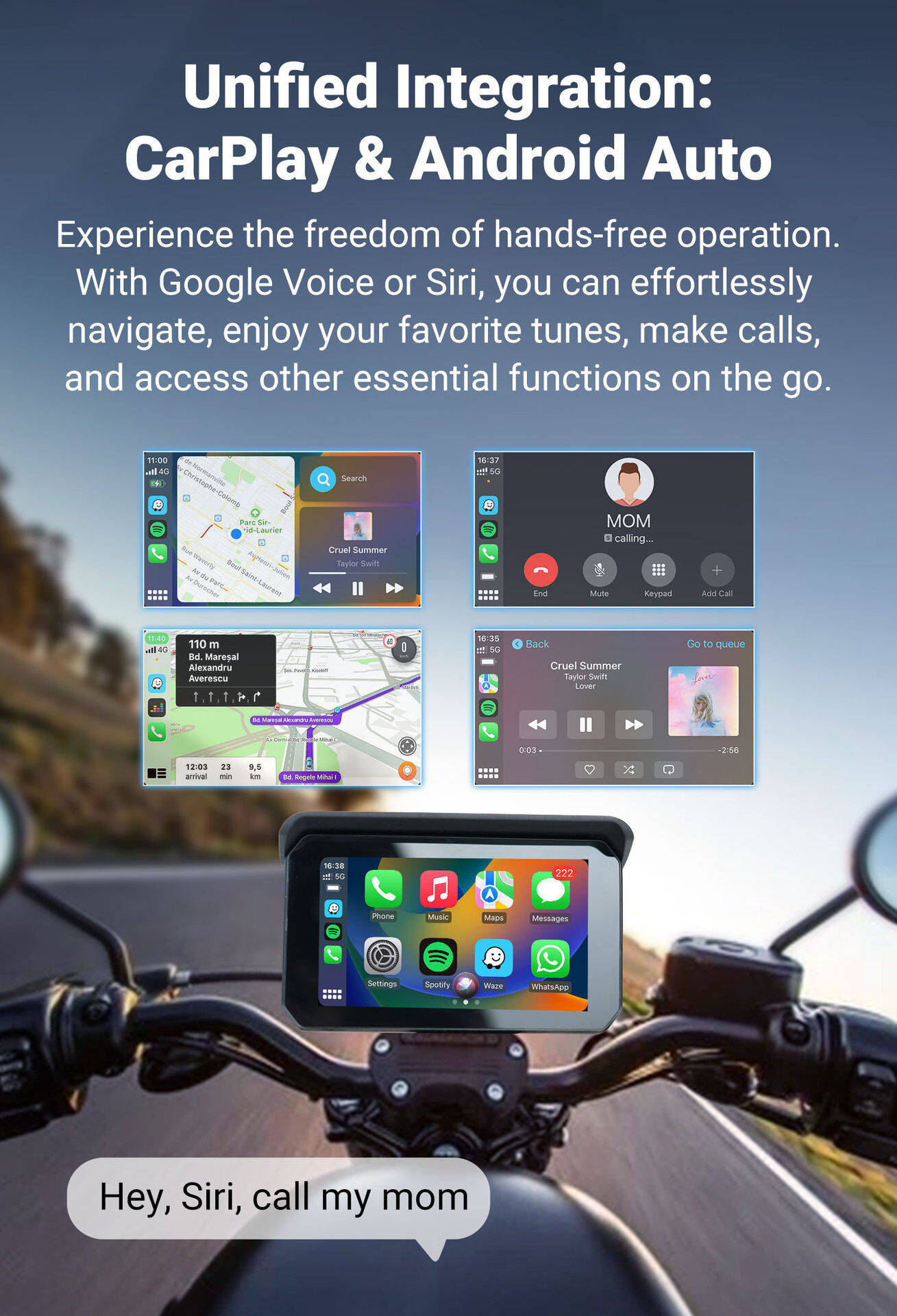 connect to your Apple mobile phone, access mobile phone address book, mail, notification, map navigation, music, video and other information, and realize voice control.A smarter, safer and more fun way to use the iPhone in your motorbike.