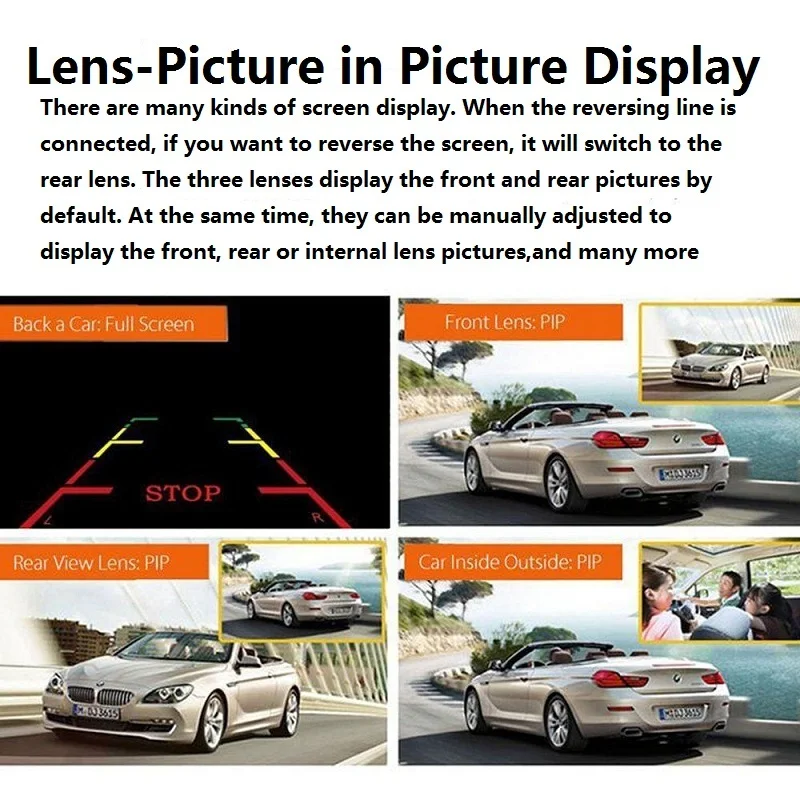 Can choose a different screen viewing mode, before and after the double record, car inside and outside the same record, large wide-angle high-definition picture quality, wider vision, safe driving more secure