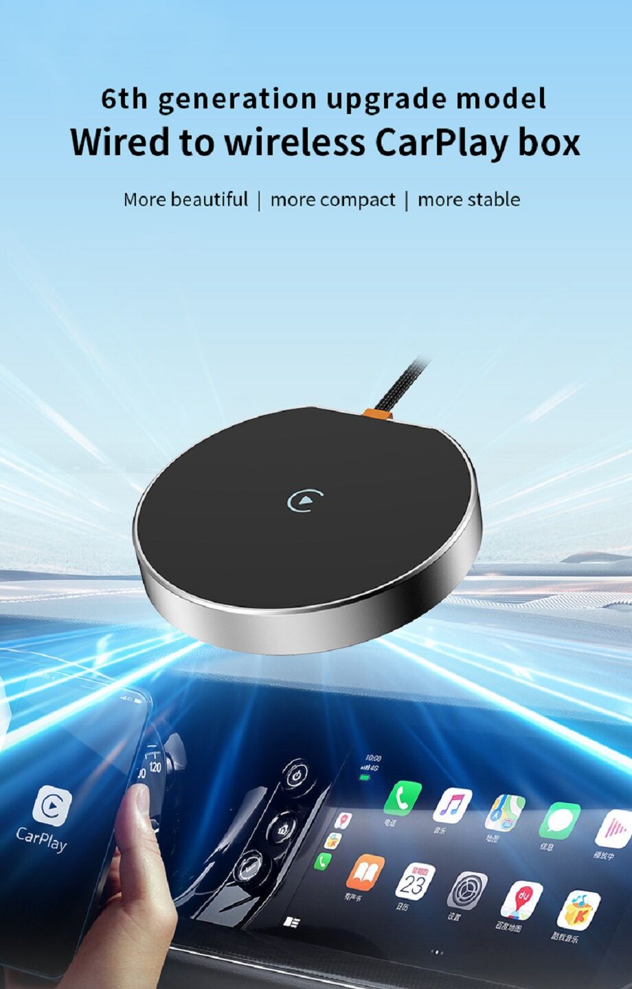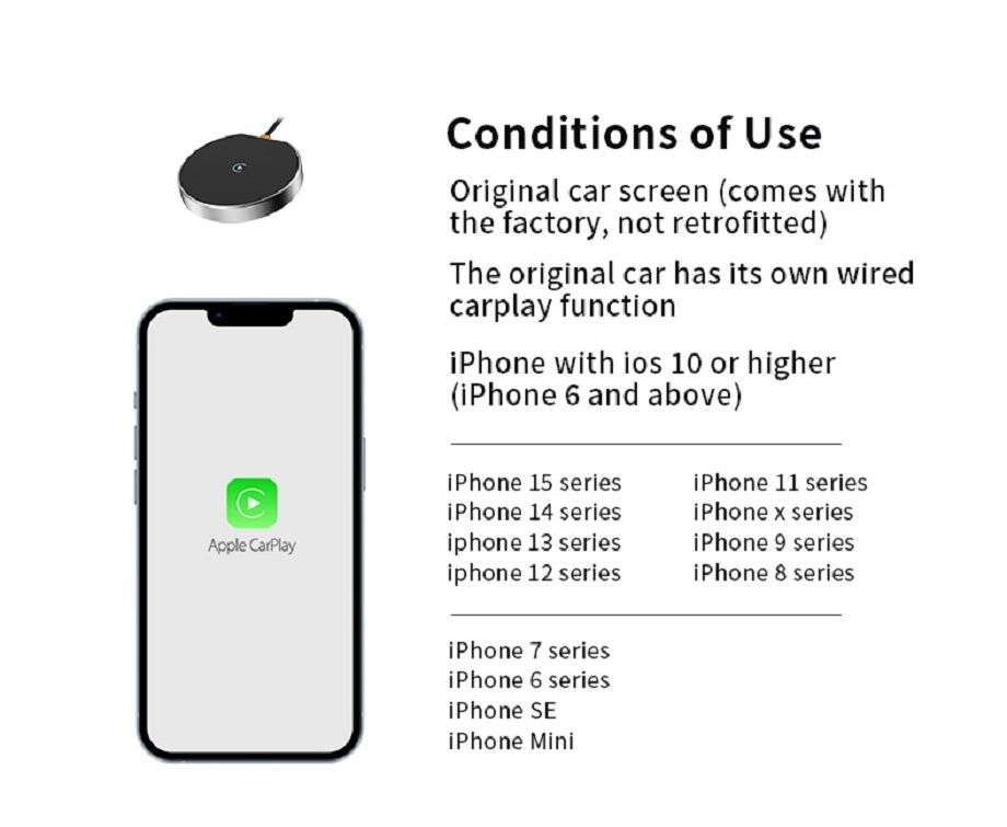 This product is suitable for models with the original car with wired CarPlay or Android Auto. Through the USB interface of the car, the original car wired CarPlay or Android Auto can be upgraded to wireless CarPlay or Android Auto. Provide users with a more convenient driving experience.