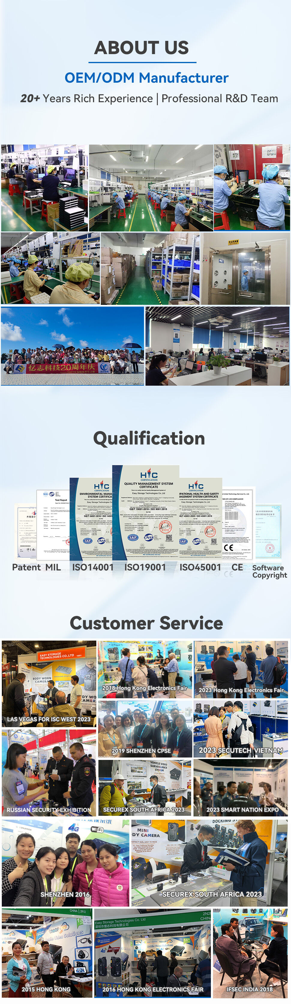 Easy Storage Technologies Co., Ltd. was established in 2002. With a dedicated R&D team, the company has been specializing in product development, production, sale and service of digital audio and video products. Our management always focuses attention on new products & new technology innovation. The MDVR has grown to the sixth generation, Body Worn Camera, which began in 2015, has grown to the third generation.