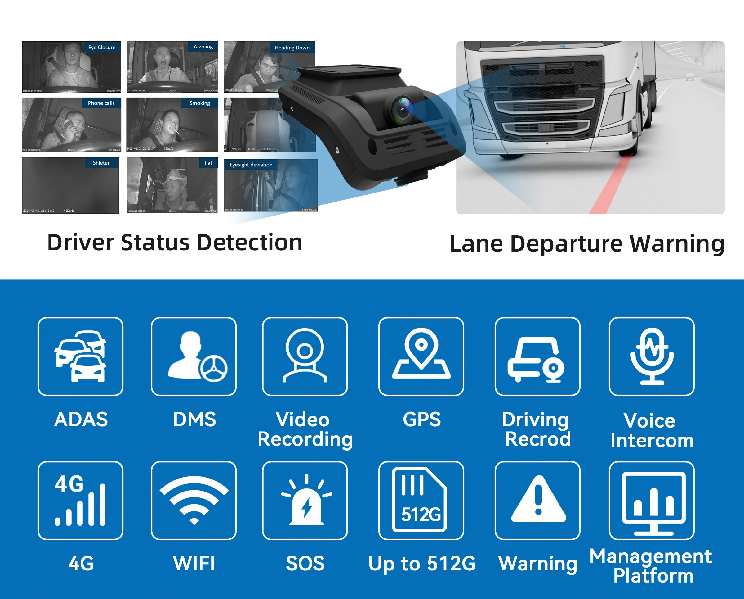 | AI – DSM | Fatigue driving detection, Smoking, call mobile phone, Occlusion, Unsafe driving behavior habit detection |