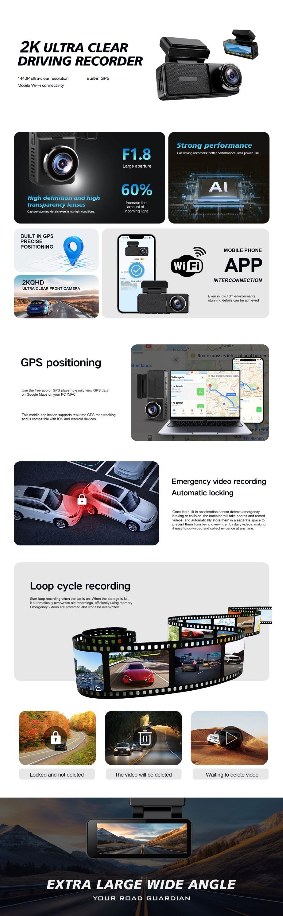 Dual-Lens WiFi Car Dash Camera 4K Front & Rear Recording, APP Control, Collision Lock, Night Vision for 24/7 Security