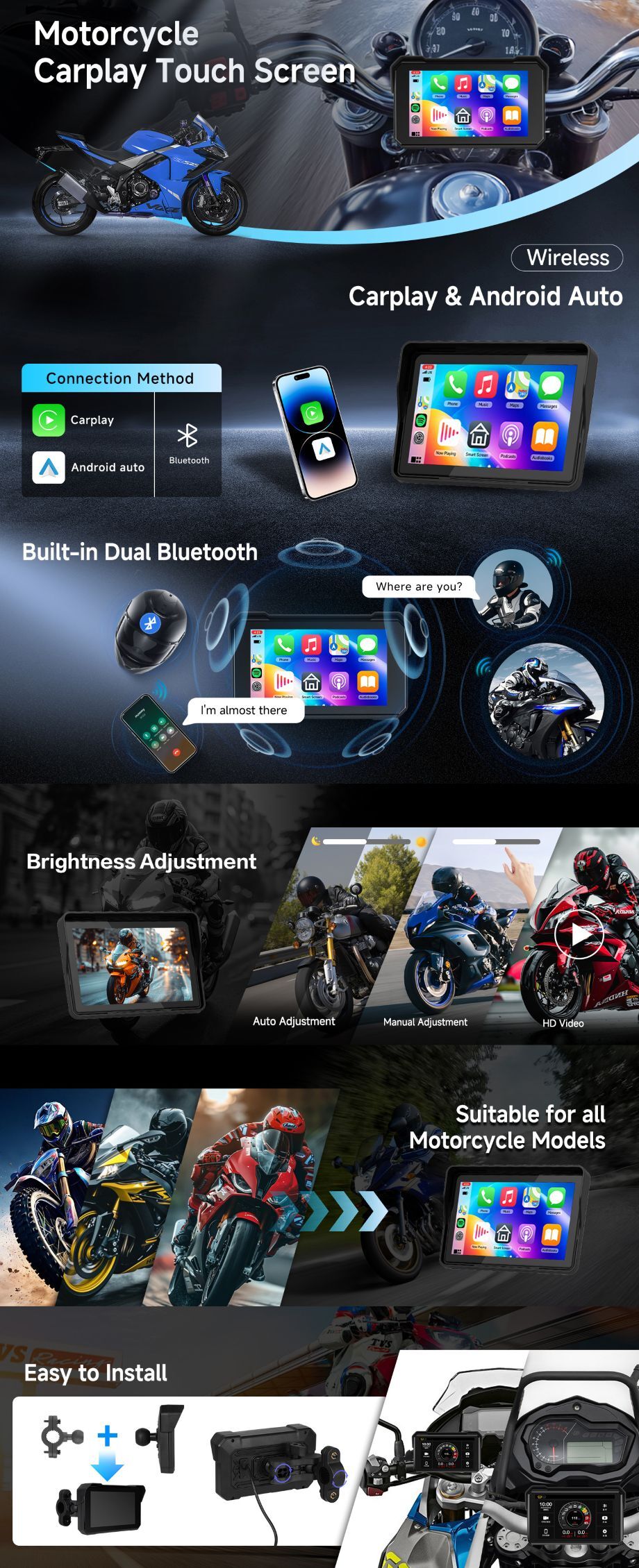EKIY Moto GPS 6.3inch Motorcycle GPS Navigation IP67 Waterproof DVR Drive Recorder Moto Monitor Wireless Carplay Android Auto