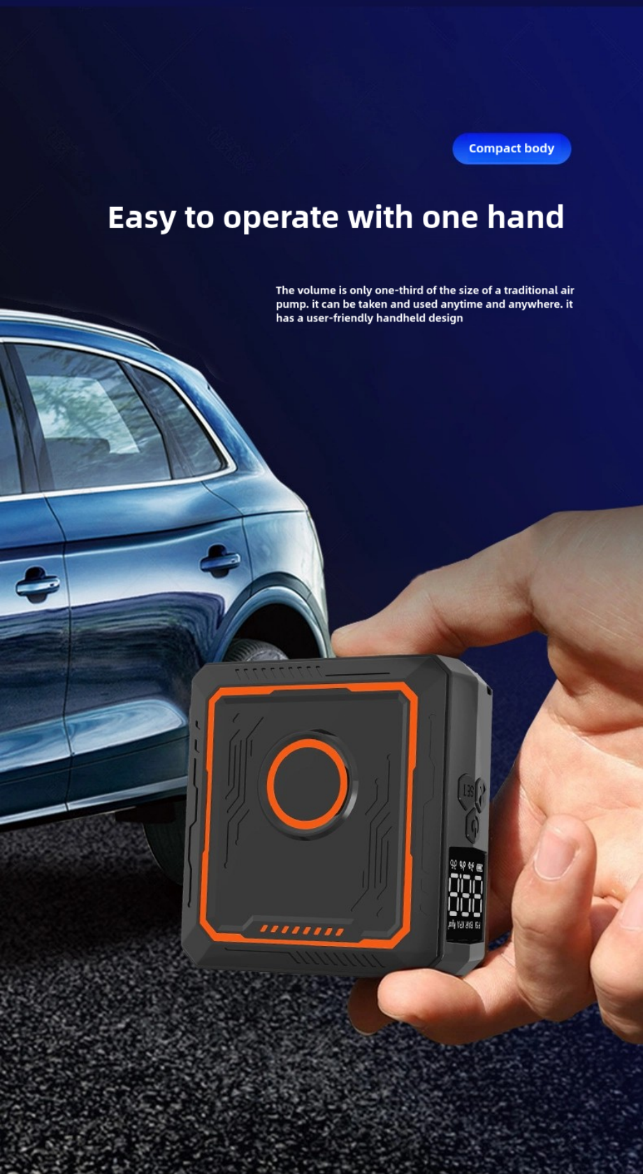 - Compact body: The volume is only one-third the size of a traditional air pump. It can be easily operated with one hand. The humanized handheld design is convenient to carry. It has multiple modes and supports multiple types of vehicles and various types of inflatable toys, such as inflating motorcycles, bicycles, automobiles, and inflatable beds.