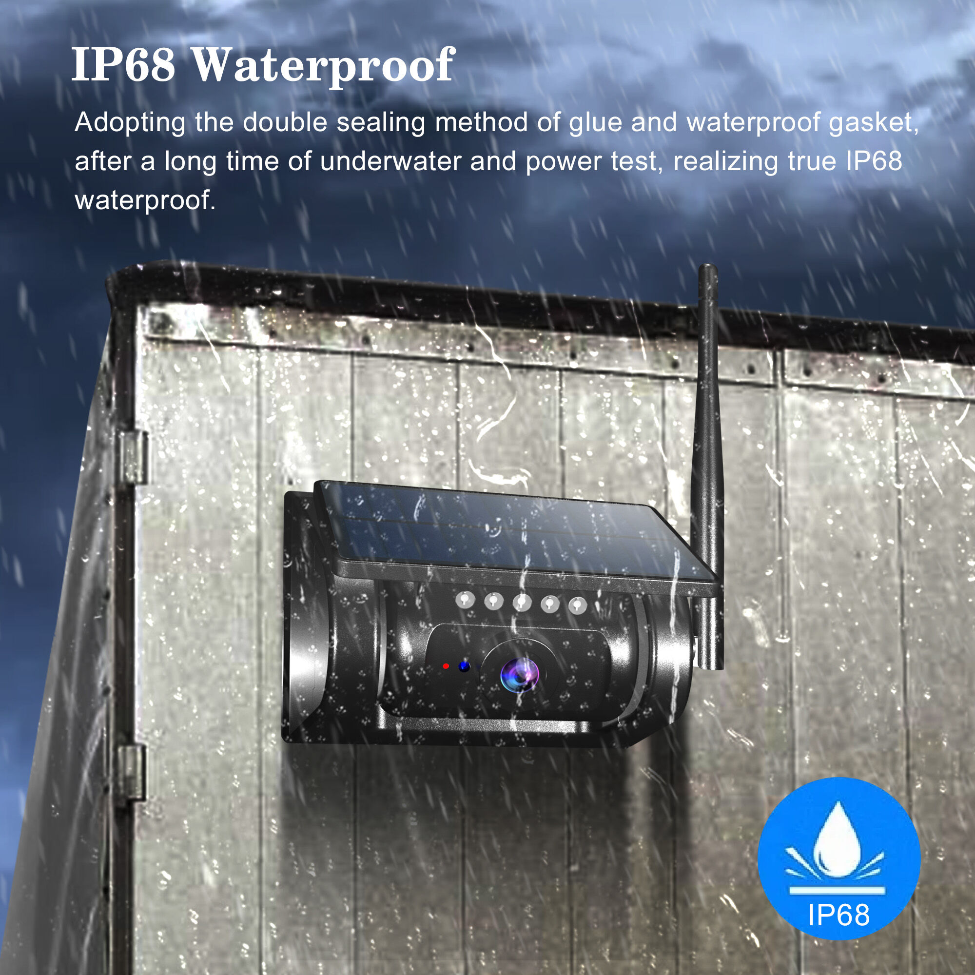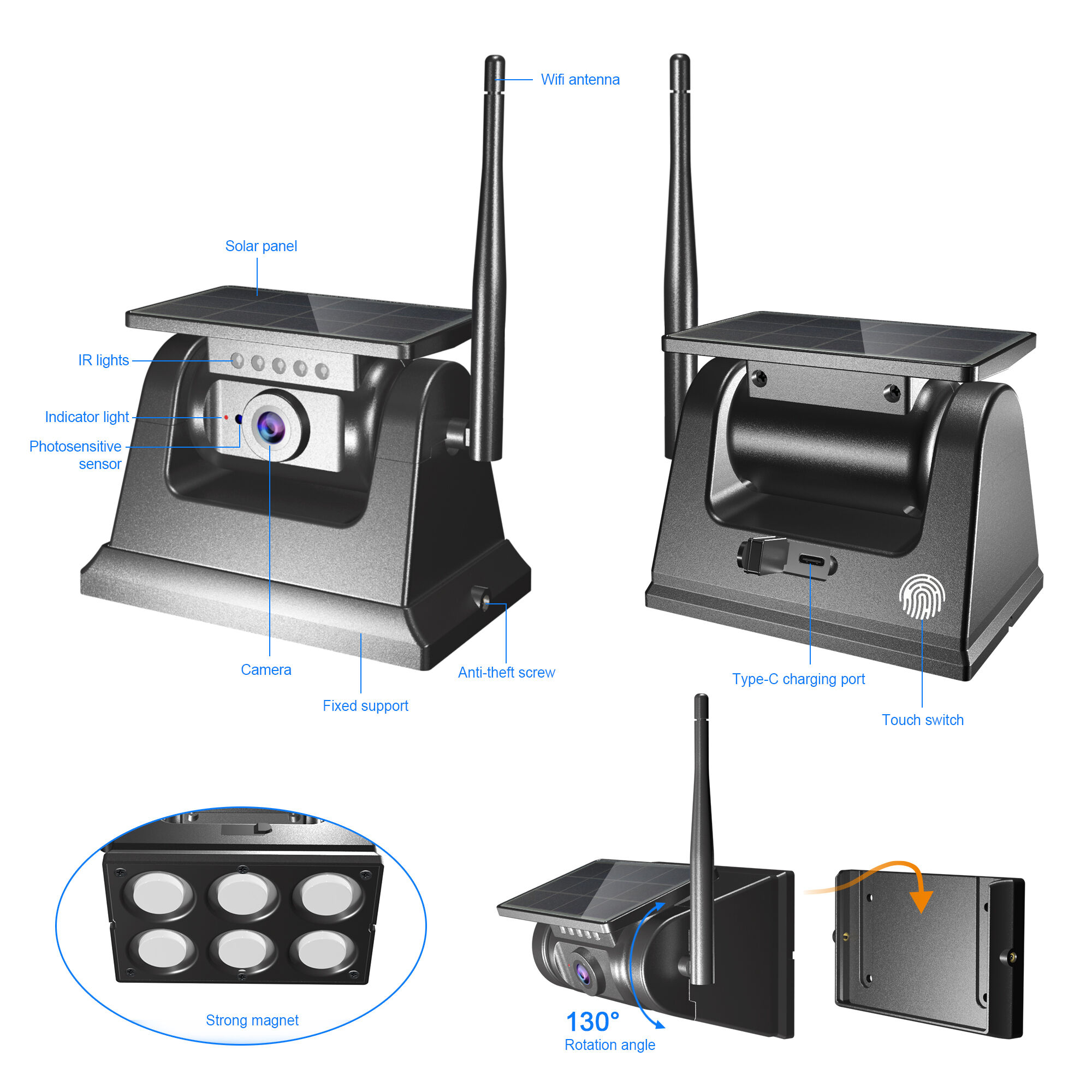 | Solar wireless magnetic Camera | Image sensor: AHD 1/2.9 140° super wide angle 720P HD camera, Pixels: 1280*720 Battery: 10000mAh super rechagable battery Strong magnetic base IR-cut & smart IR for good night vision solar power to charge built-in battery Adjustable camera tilt angles for choice power consumption: 0.06mA(Sleeping), 280mA(work) work temperature:-20°C~+70°C5v/600mA DC charging as standby for long-term dark-parking waterproof: IP68low power consumption |
