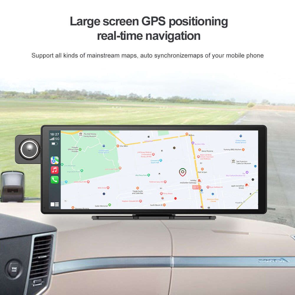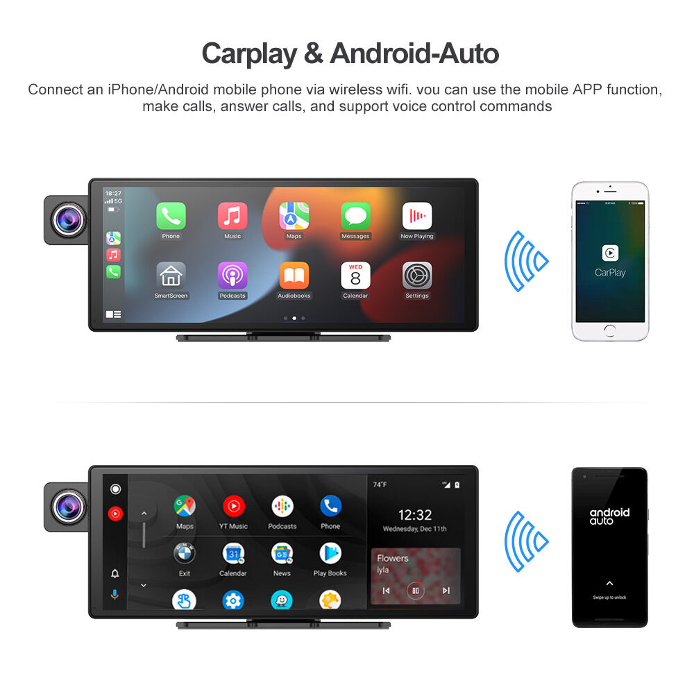 Add Wireless CarPlay & Wireless Android Auto Touchscreen To Your CarSimple connection to get a brand new touch screen experience, even if the original car does not come with a screen.The carplay display is compatible with wireless Apple Carplay and wireless Android Auto. You can use features like Siri/Maps/Music/Phone anytime, anywhere. With front and rear on-board cameras to automatically record and save video in case of emergency.Let you use a smarter and safer way to drive.