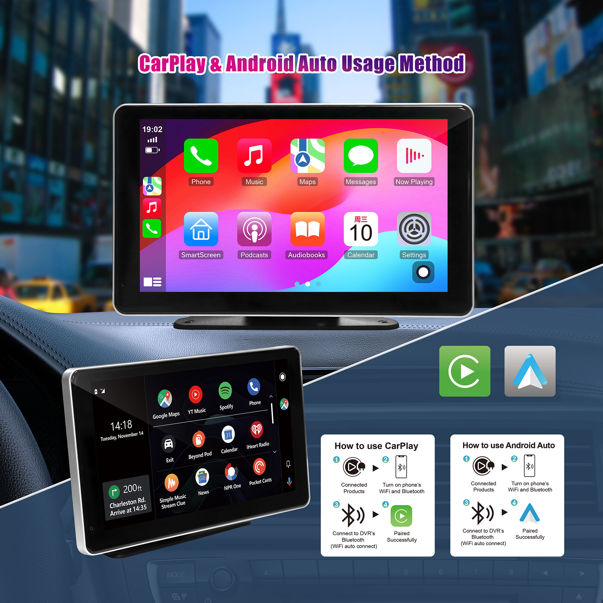 Add Wireless CarPlay & Wireless Android Auto Touchscreen To Your CarSimple connection to get a brand new touch screen experience, even if the original car does not come with a screen.The carplay display is compatible with wireless Apple Carplay and wireless Android Auto. You can use features like Siri/Maps/Music/Phone anytime, anywhere. With front and rear on-board cameras to automatically record and save video in case of emergency.Let you use a smarter and safer way to drive.