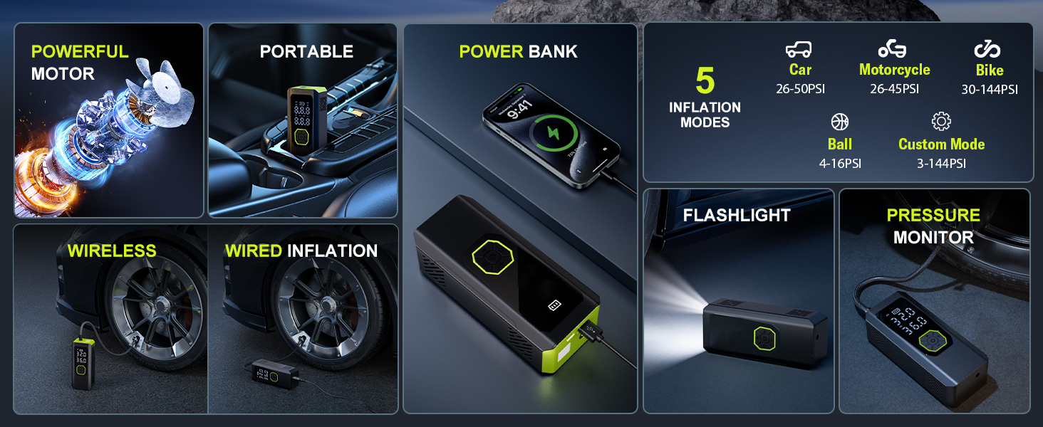 Versatile, Multiple – Accessory – Included, Tire Inflator, for All Tire Types,Travel and Daily Use
