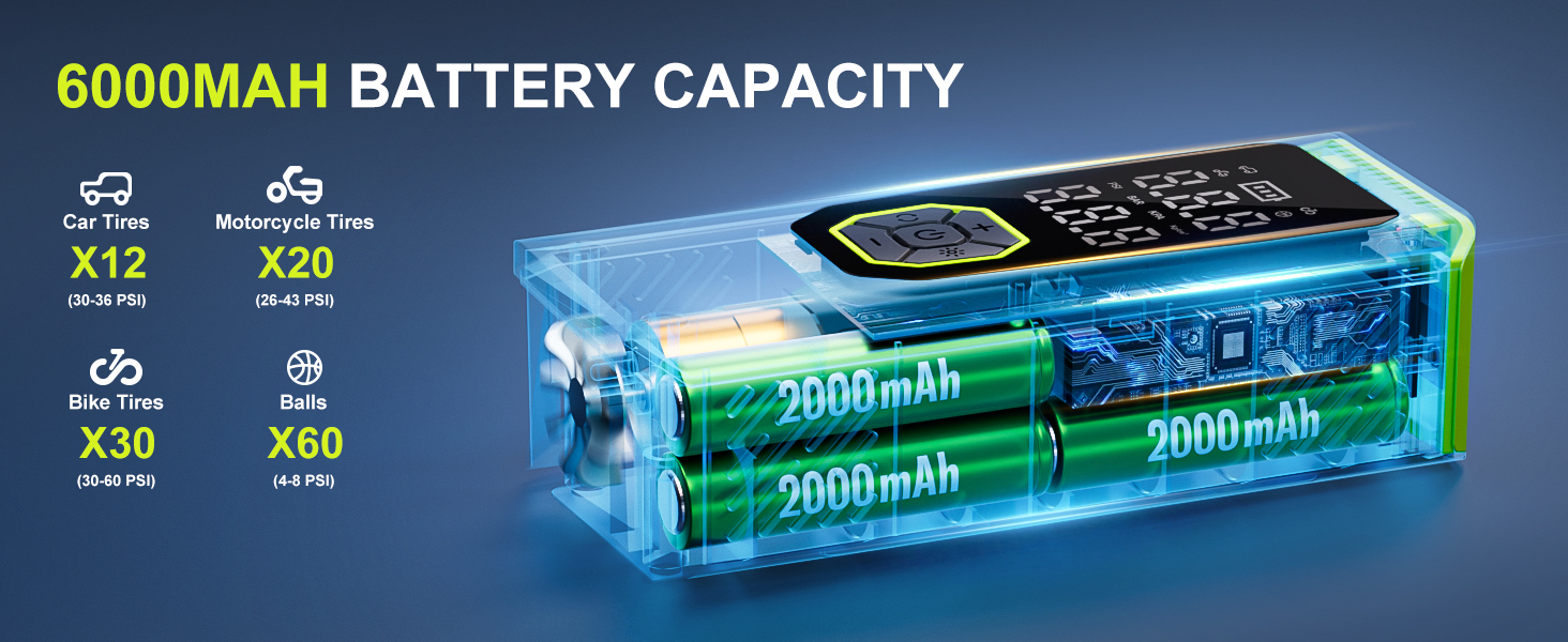 | Voltage:11.1V Cylinder Inner Diameter:22mm Rated Input:5V3A Power:72W Batteries:18650-3S1P 1500 11.1V Charging Time:3.5 Hours Inflated gas volume:25L/min Charging Port:USB Type-C Accessories: Presta Valve,Ball Needle, Air Needle*2,Air Hose,Car DC cigarette lighter cord,color box, manual, Type-C usb cable 60cm, polyester bag |