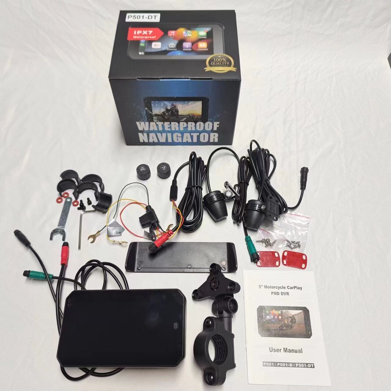 This motorcycle P501-DT navigation screen, suitable for all motorcycle vehicles. You do not need to remove the motorcycle console. Just use the equipped bracket to fix the monitor device to the motorcycle handlebars, and connect the power cord to the battery end to take power, then the monitor can work.