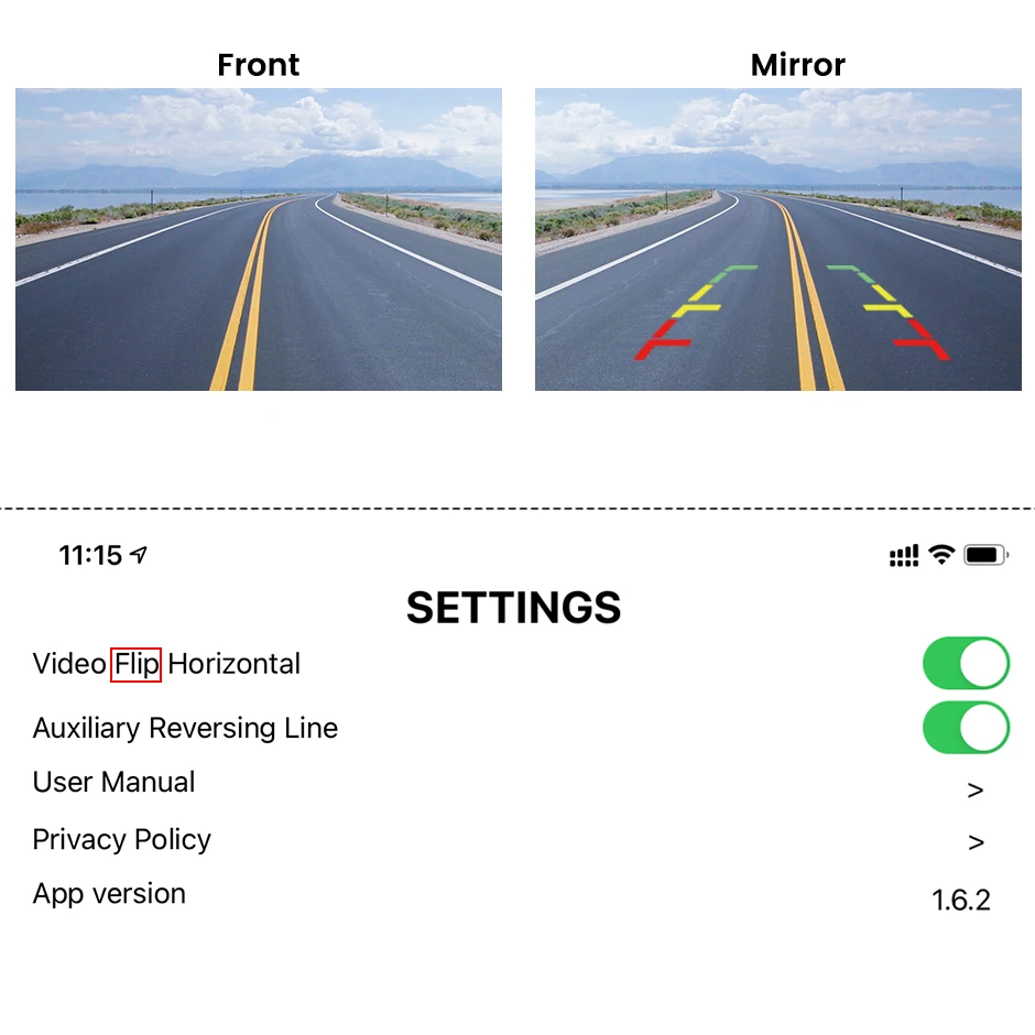 * Intelligent Voice Call Startup and Screen Image Auto Rotation—You can start the APP by voice call on both Android and IOS devices even in black screen(you will need to unlock the screen if you have set it). By putting the device in horizontal state, the screen will auto-rotate to full screen.* Can be Used as Both Front and Rear View Camera—The wireless camera produces mirror image(for rear view) by default, if you want it to show non-mirror image(for front view), you can revise in the settings to achieve this.