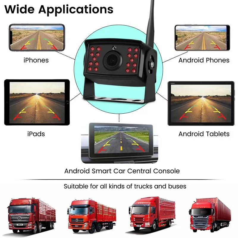 Specifications:* Compatible Smart Devices—Firstly, for any device, to use our 5G WIFI wireless reverse camera, it must support Dual Band WIFI(IEEE 802.11 a/b/g/n/ac 2.4Ghz and 5Ghz) in WLAN function, you can check it in your device’s official website to confirm this(iPhone 4 or above compatible). Secondly, the device’s operation system must be Android 5 or above and IOS 7 or above. NOTE: For old or cheap Android devices, they usually don’t support Dual Band WIFI, please check twice.