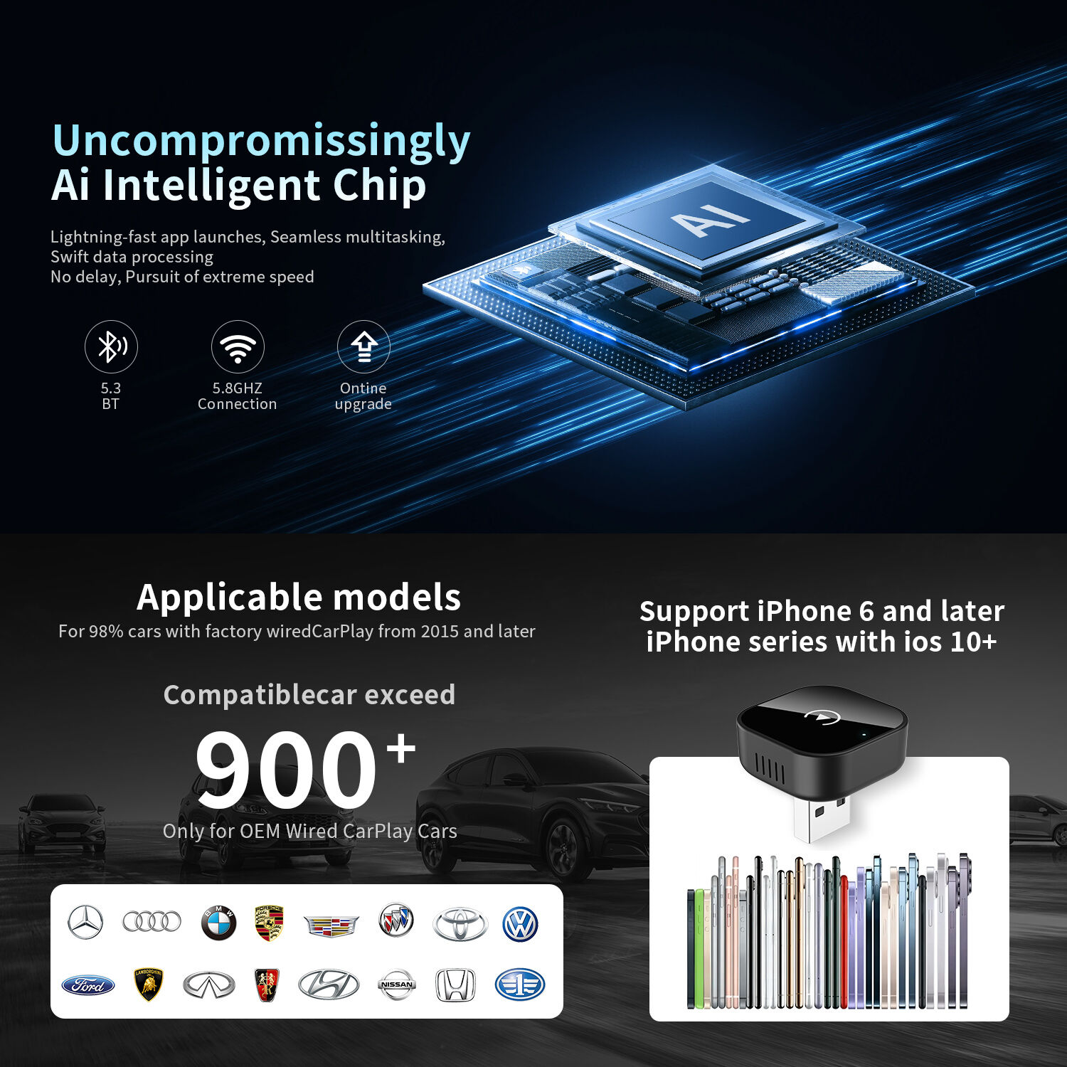 This product is suitable for models with the original car with wired CarPlay or Android Auto. Through the USB interface of the car, the original car wired CarPlay or Android Auto can be upgraded to wireless CarPlay or Android Auto. Provide users with a more convenient driving experience.