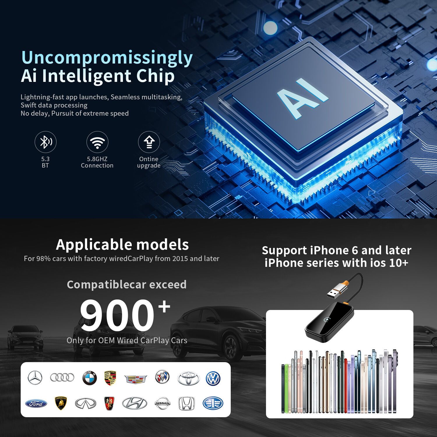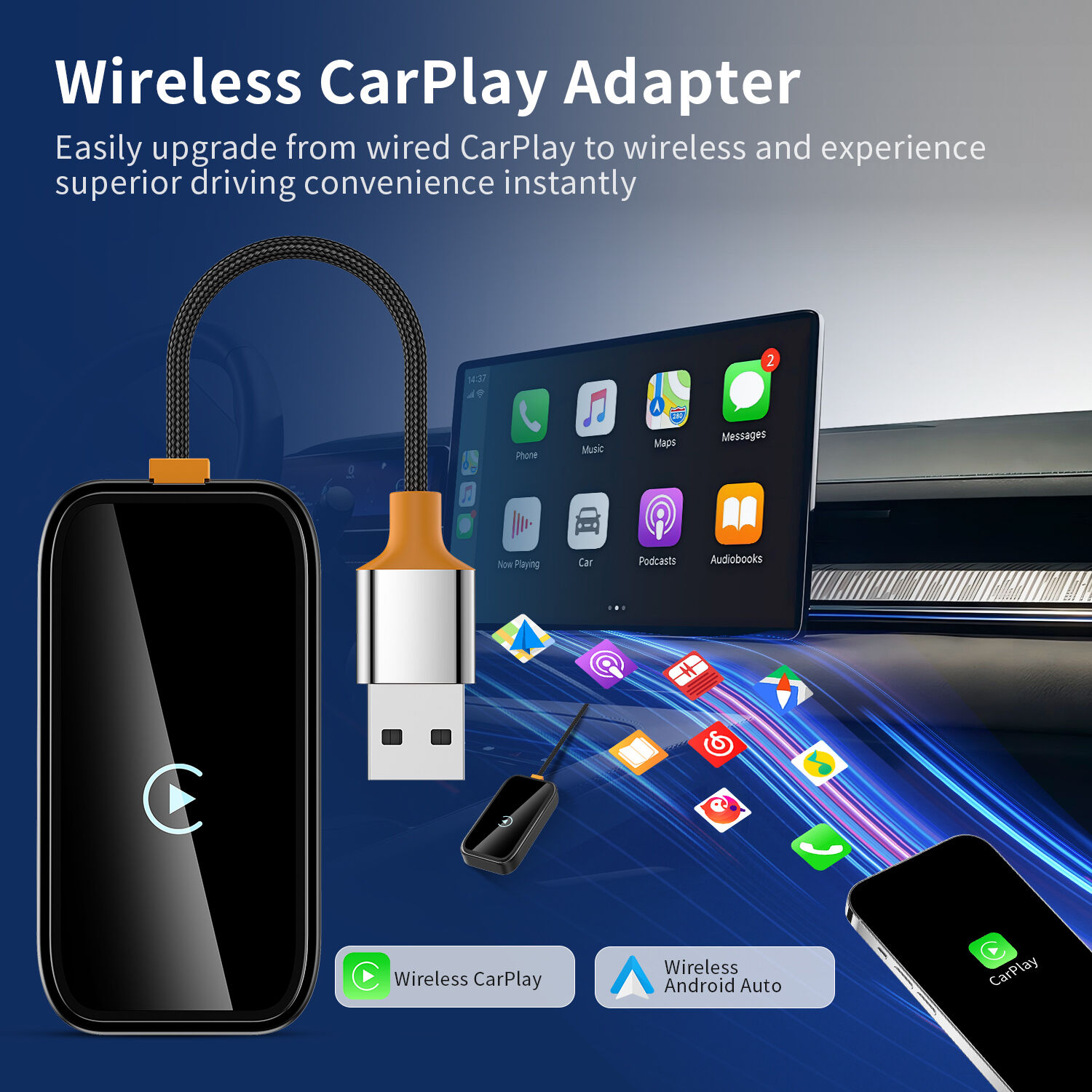 This product is suitable for models with the original car with wired CarPlay or Android Auto. Through the USB interface of the car, the original car wired CarPlay or Android Auto can be upgraded to wireless CarPlay or Android Auto. Provide users with a more convenient driving experience.