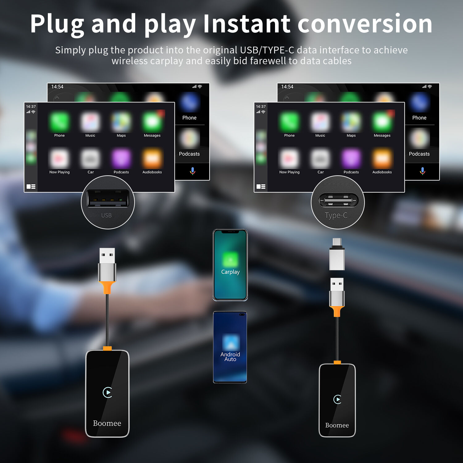 This product is suitable for models with the original car with wired CarPlay or Android Auto. Through the USB interface of the car, the original car wired CarPlay or Android Auto can be upgraded to wireless CarPlay or Android Auto. Provide users with a more convenient driving experience.